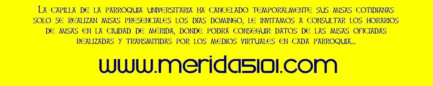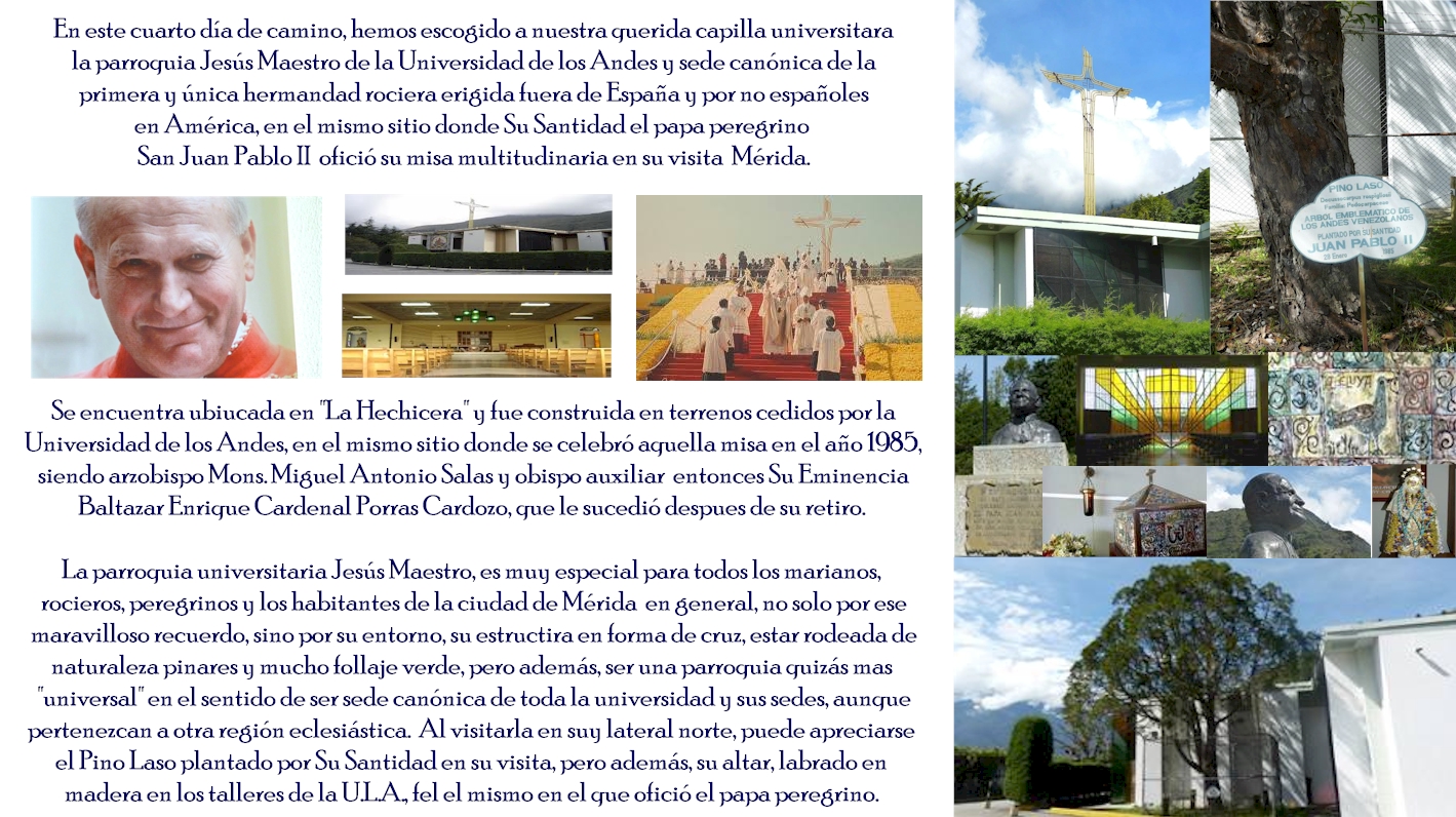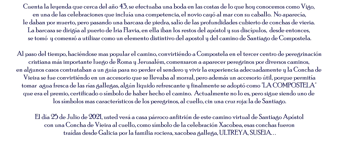 El camino de Santiago Apóstol Mérida 2021, es un sendero simbólico, de oración y este año virtual, gestionado por la humilde, fervorosa, paciente y caritativa  hermandad de Nuestra Señora del Rocío Rocieros de Corazón establecida canónicamente en la arquidiócesis de Mérida en Venezuela;  el camino se hace este año de modo remoto, virtual, es decir a distancia  aprovechando las bondades de las redes sociales y medios digitales atendiendo las normas de confinamiento, aforos reducidos y normativa del clero y autoridades civiles nacionales causadas por la situación de pandemia.   El camino de Santiago en Mérida tiene como domicilio a la sede canónica alterna  de la hermandad, la parroquia Santiago Apóstol de la Punta, conocida popularmente como  "LA PARROQUIA" de Mérida. El camino de Santiago en Mérida esta inspirado en el camino de fe y oración gestionado desde 2006 por la cofradía del apóstol Santiago en Caracas, que a su vez está inspirado en la peregrinación que hacen miles de peregrinos y fieles de todo el mundo a la catedral de Santiago de Compostela para visitar las reliquias del apóstol peregrino. Toda la información, enlaces y referencias o fotos contenidas en este portal son referenciales y pueden estar sujetas a derechos de autor por pertenecer en algunos casos a entes privados, por esta razón se prohíbe absolutamente el uso de información e imágenes con fines comerciales o diferentes a la información y complemento del camino sin la respectiva autorización explicita de su propietario. Este portal es gestionado por B.A.C.A. y diseñado por @romeroyperegrino.  En caso de citas, referencias, fotos, videos o enlaces externos, videos referenciales de otras plataformas y portales compartidos e incluidos en este espacio web, al ser espacios públicos y de referencia general, no podemos hacernos responsables por cambios sin previo aviso generados por el o los propietarios.  Si necesita hacer una sugerencia, reclamo, requiere cualquier tipo de información o desea comunicarse con nosotros puede escribirnos a:  info@caminodesantiagoapostol.com