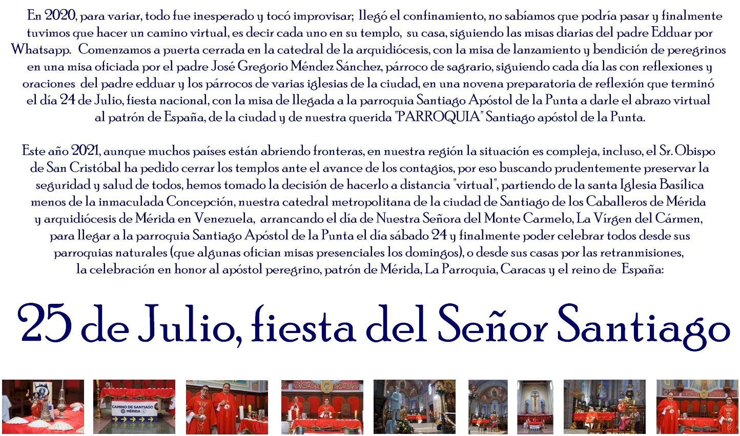 El camino de Santiago Apóstol Mérida 2021, es un sendero simbólico, de oración y este año virtual, gestionado por la humilde, fervorosa, paciente y caritativa  hermandad de Nuestra Señora del Rocío Rocieros de Corazón establecida canónicamente en la arquidiócesis de Mérida en Venezuela;  el camino se hace este año de modo remoto, virtual, es decir a distancia  aprovechando las bondades de las redes sociales y medios digitales atendiendo las normas de confinamiento, aforos reducidos y normativa del clero y autoridades civiles nacionales causadas por la situación de pandemia.   El camino de Santiago en Mérida tiene como domicilio a la sede canónica alterna  de la hermandad, la parroquia Santiago Apóstol de la Punta, conocida popularmente como  "LA PARROQUIA" de Mérida. El camino de Santiago en Mérida esta inspirado en el camino de fe y oración gestionado desde 2006 por la cofradía del apóstol Santiago en Caracas, que a su vez está inspirado en la peregrinación que hacen miles de peregrinos y fieles de todo el mundo a la catedral de Santiago de Compostela para visitar las reliquias del apóstol peregrino. Toda la información, enlaces y referencias o fotos contenidas en este portal son referenciales y pueden estar sujetas a derechos de autor por pertenecer en algunos casos a entes privados, por esta razón se prohíbe absolutamente el uso de información e imágenes con fines comerciales o diferentes a la información y complemento del camino sin la respectiva autorización explicita de su propietario. Este portal es gestionado por B.A.C.A. y diseñado por @romeroyperegrino.  En caso de citas, referencias, fotos, videos o enlaces externos, videos referenciales de otras plataformas y portales compartidos e incluidos en este espacio web, no podemos hacernos responsables por cambios sin previo aviso generados por el o los propietarios.  Si necesita hacer una sugerencia, reclamo, cualquier tipo de información o desea comunicarse con nosotros puede escribirnos a:  info@aminodesantiagoapostol.com