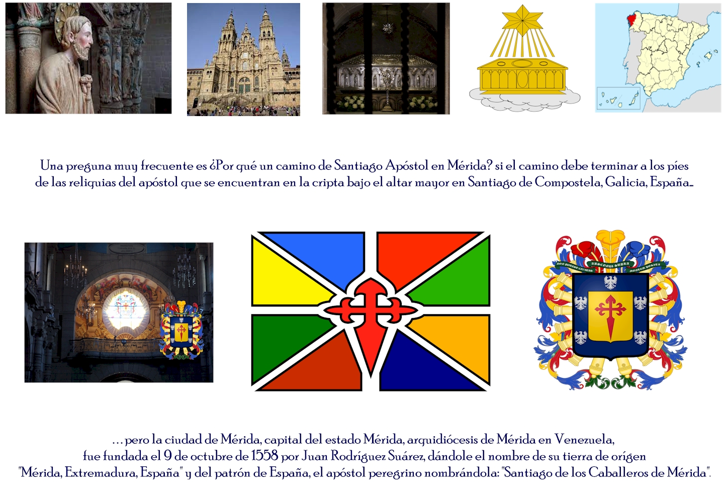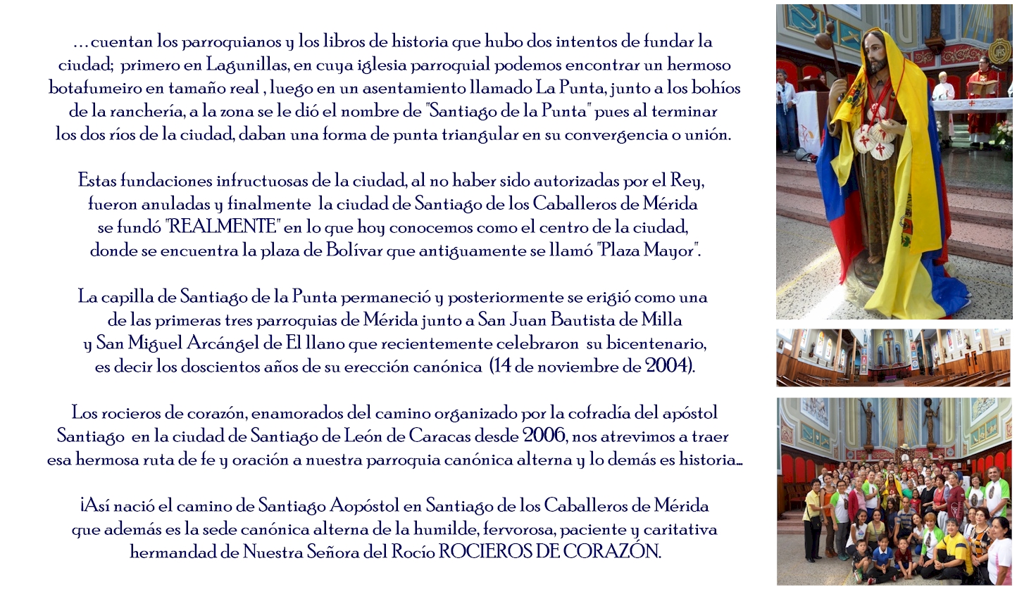 El camino de Santiago Apóstol Mérida 2021, es un sendero simbólico, de oración y este año virtual, gestionado por la humilde, fervorosa, paciente y caritativa  hermandad de Nuestra Señora del Rocío Rocieros de Corazón establecida canónicamente en la arquidiócesis de Mérida en Venezuela;  el camino se hace este año de modo remoto, virtual, es decir a distancia  aprovechando las bondades de las redes sociales y medios digitales atendiendo las normas de confinamiento, aforos reducidos y normativa del clero y autoridades civiles nacionales causadas por la situación de pandemia.   El camino de Santiago en Mérida tiene como domicilio a la sede canónica alterna  de la hermandad, la parroquia Santiago Apóstol de la Punta, conocida popularmente como  "LA PARROQUIA" de Mérida. El camino de Santiago en Mérida esta inspirado en el camino de fe y oración gestionado desde 2006 por la cofradía del apóstol Santiago en Caracas, que a su vez está inspirado en la peregrinación que hacen miles de peregrinos y fieles de todo el mundo a la catedral de Santiago de Compostela para visitar las reliquias del apóstol peregrino. Toda la información, enlaces y referencias o fotos contenidas en este portal son referenciales y pueden estar sujetas a derechos de autor por pertenecer en algunos casos a entes privados, por esta razón se prohíbe absolutamente el uso de información e imágenes con fines comerciales o diferentes a la información y complemento del camino sin la respectiva autorización explicita de su propietario. Este portal es gestionado por B.A.C.A. y diseñado por @romeroyperegrino.  En caso de citas, referencias, fotos, videos o enlaces externos, videos referenciales de otras plataformas y portales compartidos e incluidos en este espacio web, no podemos hacernos responsables por cambios sin previo aviso generados por el o los propietarios.  Si necesita hacer una sugerencia, reclamo, cualquier tipo de información o desea comunicarse con nosotros puede escribirnos a:  info@aminodesantiagoapostol.com