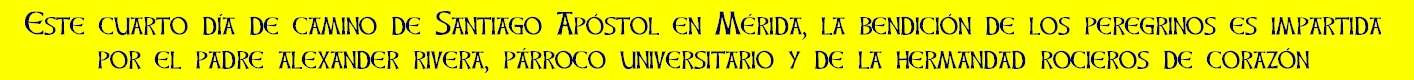 El camino de Santiago Apóstol Mérida 2021, es un sendero simbólico, de oración y este año virtual, gestionado por la humilde, fervorosa, paciente y caritativa  hermandad de Nuestra Señora del Rocío Rocieros de Corazón establecida canónicamente en la arquidiócesis de Mérida en Venezuela;  el camino se hace este año de modo remoto, virtual, es decir a distancia  aprovechando las bondades de las redes sociales y medios digitales atendiendo las normas de confinamiento, aforos reducidos y normativa del clero y autoridades civiles nacionales causadas por la situación de pandemia.   El camino de Santiago en Mérida tiene como domicilio a la sede canónica alterna  de la hermandad, la parroquia Santiago Apóstol de la Punta, conocida popularmente como  "LA PARROQUIA" de Mérida. El camino de Santiago en Mérida esta inspirado en el camino de fe y oración gestionado desde 2006 por la cofradía del apóstol Santiago en Caracas, que a su vez está inspirado en la peregrinación que hacen miles de peregrinos y fieles de todo el mundo a la catedral de Santiago de Compostela para visitar las reliquias del apóstol peregrino. Toda la información, enlaces y referencias o fotos contenidas en este portal son referenciales y pueden estar sujetas a derechos de autor por pertenecer en algunos casos a entes privados, por esta razón se prohíbe absolutamente el uso de información e imágenes con fines comerciales o diferentes a la información y complemento del camino sin la respectiva autorización explicita de su propietario. Este portal es gestionado por B.A.C.A. y diseñado por @romeroyperegrino.  En caso de citas, referencias, fotos, videos o enlaces externos, videos referenciales de otras plataformas y portales compartidos e incluidos en este espacio web, al ser espacios públicos y de referencia general, no podemos hacernos responsables por cambios sin previo aviso generados por el o los propietarios.  Si necesita hacer una sugerencia, reclamo, requiere cualquier tipo de información o desea comunicarse con nosotros puede escribirnos a:  info@caminodesantiagoapostol.com