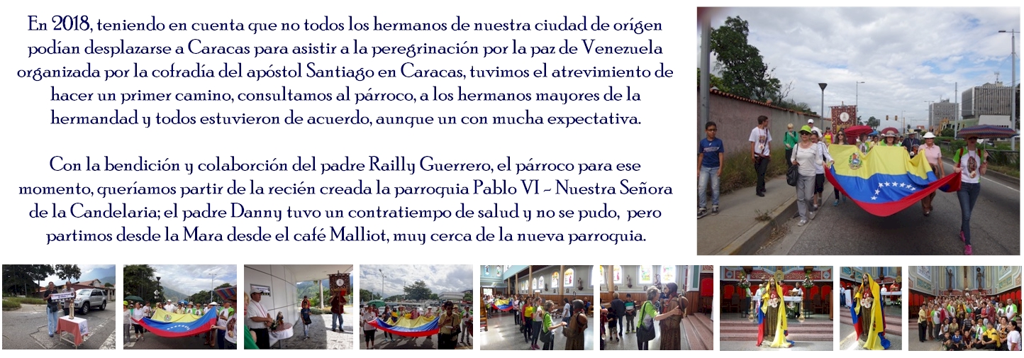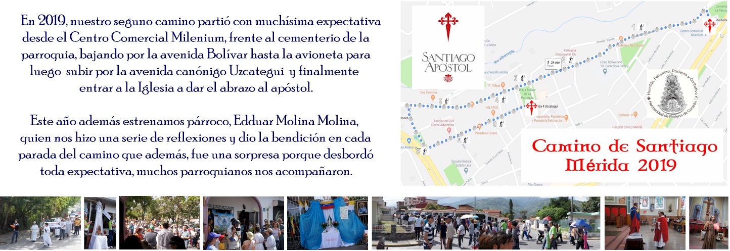 El camino de Santiago Apóstol Mérida 2021, es un sendero simbólico, de oración y este año virtual, gestionado por la humilde, fervorosa, paciente y caritativa  hermandad de Nuestra Señora del Rocío Rocieros de Corazón establecida canónicamente en la arquidiócesis de Mérida en Venezuela;  el camino se hace este año de modo remoto, virtual, es decir a distancia  aprovechando las bondades de las redes sociales y medios digitales atendiendo las normas de confinamiento, aforos reducidos y normativa del clero y autoridades civiles nacionales causadas por la situación de pandemia.   El camino de Santiago en Mérida tiene como domicilio a la sede canónica alterna  de la hermandad, la parroquia Santiago Apóstol de la Punta, conocida popularmente como  "LA PARROQUIA" de Mérida. El camino de Santiago en Mérida esta inspirado en el camino de fe y oración gestionado desde 2006 por la cofradía del apóstol Santiago en Caracas, que a su vez está inspirado en la peregrinación que hacen miles de peregrinos y fieles de todo el mundo a la catedral de Santiago de Compostela para visitar las reliquias del apóstol peregrino. Toda la información, enlaces y referencias o fotos contenidas en este portal son referenciales y pueden estar sujetas a derechos de autor por pertenecer en algunos casos a entes privados, por esta razón se prohíbe absolutamente el uso de información e imágenes con fines comerciales o diferentes a la información y complemento del camino sin la respectiva autorización explicita de su propietario. Este portal es gestionado por B.A.C.A. y diseñado por @romeroyperegrino.  En caso de citas, referencias, fotos, videos o enlaces externos, videos referenciales de otras plataformas y portales compartidos e incluidos en este espacio web, no podemos hacernos responsables por cambios sin previo aviso generados por el o los propietarios.  Si necesita hacer una sugerencia, reclamo, cualquier tipo de información o desea comunicarse con nosotros puede escribirnos a:  info@aminodesantiagoapostol.com
