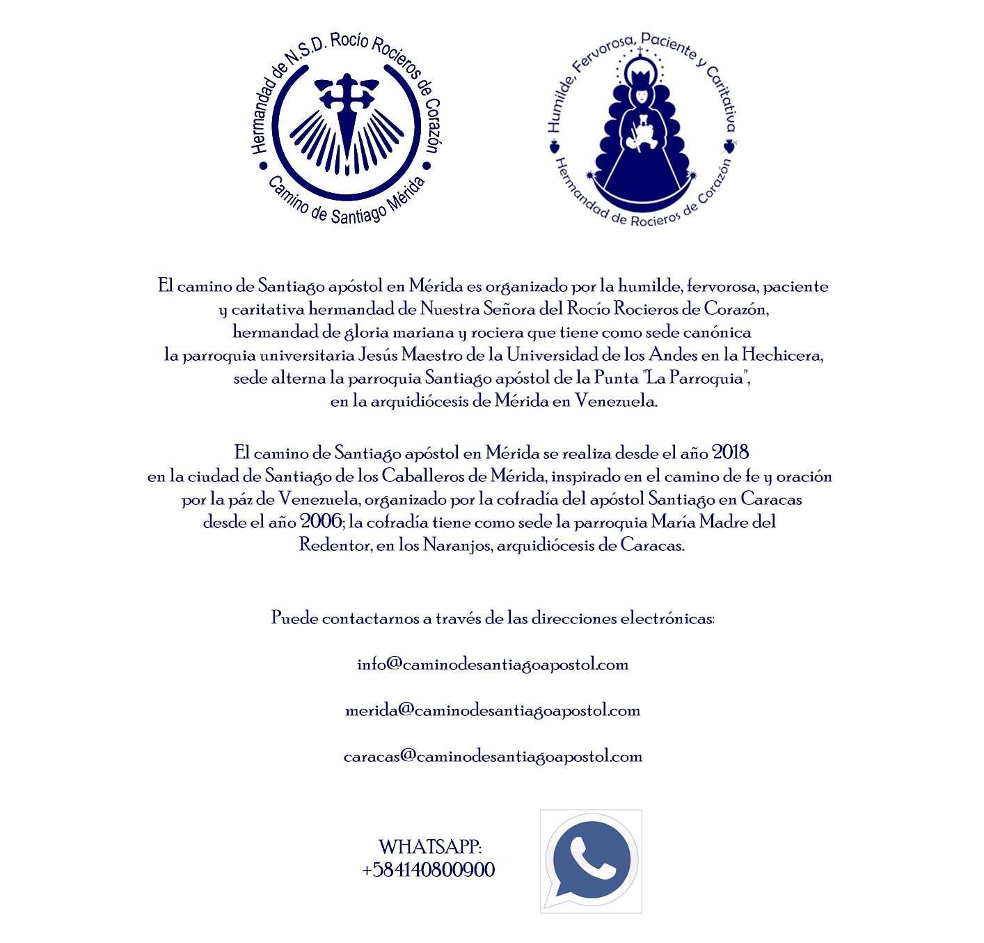 El camino de Santiago Apóstol Mérida 2021, es un sendero simbólico, de oración y este año virtual, gestionado por la humilde, fervorosa, paciente y caritativa hermandad de Nuestra Señora del Rocío Rocieros de Corazón establecida canónicamente en la arquidiócesis de Mérida en Venezuela; el camino se hace este año de modo remoto, virtual, es decir a distancia aprovechando las bondades de las redes sociales y medios digitales atendiendo las normas de confinamiento, aforos reducidos y normativa del clero y autoridades civiles nacionales causadas por la situación de pandemia. El camino de Santiago en Mérida tiene como domicilio a la sede canónica alterna de la hermandad, la parroquia Santiago Apóstol de la Punta, conocida popularmente como "LA PARROQUIA" de Mérida. El camino de Santiago en Mérida esta inspirado en el camino de fe y oración gestionado desde 2006 por la cofradía del apóstol Santiago en Caracas, que a su vez está inspirado en la peregrinación que hacen miles de peregrinos y fieles de todo el mundo a la catedral de Santiago de Compostela para visitar las reliquias del apóstol peregrino. Toda la información, enlaces y referencias o fotos contenidas en este portal son referenciales y pueden estar sujetas a derechos de autor por pertenecer en algunos casos a entes privados, por esta razón se prohíbe absolutamente el uso de información e imágenes con fines comerciales o diferentes a la información y complemento del camino sin la respectiva autorización explicita de su propietario. Este portal es gestionado por B.A.C.A. y diseñado por @romeroyperegrino. En caso de citas, referencias, fotos, videos o enlaces externos, videos referenciales de otras plataformas y portales compartidos e incluidos en este espacio web, no podemos hacernos responsables por cambios sin previo aviso generados por el o los propietarios. Si necesita hacer una sugerencia, reclamo, cualquier tipo de información o desea comunicarse con nosotros puede escribirnos a: info@aminodesantiagoapostol.com |